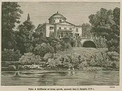 A woodcut print from 1879, depicting Królikarnia palace and Królikarnia Pond.