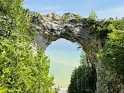 Arch Rock is a geological formation on Mackinac Island in Michigan. It is a natural limestone arch formed during the Nipissing post-glacial period, a period of high Lake Huron levels following the end of the Wisconsin glaciation. To this day Arch Rock stands on the Lake Huron shoreline 146 feet (45 m) above the water.