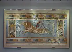 Palaces of the Minoan period were multi-functional; they were the religious, economic and political administrative centres for the whole of the Minoan society.[13] Basic palace structures consisted of a Central court, which was the main focus of the palace, where most theatrical and political events took place.[14] The Central court is also believed to be the room where the cultural or religious activity of bull-leaping, which is depicted in the Bull-leaping Fresco located in the Palace of Knossos on Crete, took place.[14] Other rooms within the basic palace structure consisted of residential quarters, workshops and crafts rooms, storerooms for surplus foodstuffs, and rooms for religious practice.[13]