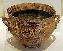 A krater vase found at Melos, Greece. It is decorated in the Late Geometric design; dated from some time between 730 and 690 BC.