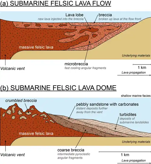Effusive felsic lava flows elongate several kilometres. During an eruption, lava continuously wells out from the vent, then starts to flow outward on the sea floor. Due to quenching, lava is rapidly fragmented to form breccia.[40] A new lobe of lava is injected inside the breccia but it is cooled less quickly, and pushes the flow further outwards.[7]