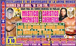 - ^ Vacah, Jose (April 30, 2016). "Resultados Final del Torneo Increíble de Parejas: Místico y Mephisto conquistan el Paraíso". Súper Luchas (in Spanish). Retrieved April 30, 2016.