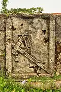 Beside the front entrance of the fortified church complex is a single level, coral-stone structure built together with the church. It was used as a leprosarium during the Spanish period and as an autopsy area for those who died tragically during the American era.[1] The facade's pediment features very ornate carvings of angels and human figures, with skull and bone details that explain the function of the structure.