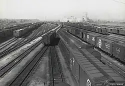 In 1875, the Atchison, Topeka and Santa Fe Railway (AT&SF) began constructing the first railroad facilities in Argentine with warehouses and workshops, which were expanded into a passenger, freight and classification yard with over 40 km of track by 1890.[4] As at many other freight yards in the Midwest, the AT&SF also built a grain elevator with a large silo complex. The increasing mechanization of agriculture greatly increased the volume of grain handled in the 1920s,[5] forcing the expansion of the complex's capacity from the original 1 million bushels to over 10 million bushels (about 350,000 m3), creating the second largest facility in the United States; it was operated by the lessee Davis-Noland-Merrill Grain Company.[6][7]