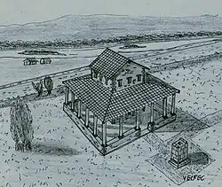 The Mithraeum, which was examined between 1976 and 1979, stood east of the city and was used to worship the Persian god of light Mithras, whose cult was particularly popular among soldiers. The building had a long rectangular floor plan, was oriented to the north and consisted of two cult rooms and a vestibule (pronaos). The slightly lower interior could be entered via two steps. On both sides of the first room there were brick benches that were used by the believers at the cult meal. In the exedra at the north end of the building there were still some limestone fragments of a relief showing the deity killing a bull (Tauroctony). The Mithraeum in Biesheim probably belongs to the purely civil phase of the settlement after the garrison had withdrawn around 70 AD. According to the coin finds, the sanctuary was destroyed at the end of the 4th century.