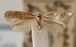 The wingspan is 7–9 mm. The head is white. Forewings are violet-whitish, suffusedly mixed and irrorated with brownish golden; a transverse oblique mark from middle of dorsum, a small spot on middle of costa and another beyond it usually darker golden-brown; some small darker spots towards apex. Hindwings are pale grey.[2][3]