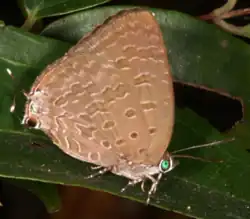 Arhopala aida or white-stained oakblue, is a species of butterfly belonging to the lycaenid family described by Lionel de Nicéville in 1889. It is found in Southeast Asia (Burma, Mergui, Thailand, Langkawi, Pulau Tenggol, Indochina, Hainan, and Peninsular Malaya). The upper surface of the male is lilac the black marginal band on both wings above equally broad. The under surface is brown with a distinct violet gloss;forewing with a light hindmarginal area. The female is above bluer, lighter than the male, and has a much broader black margin. [2] aida differs from Ahropalus myrtale in its darker and more violet-blue and its broad outer margins; the undersides are, however, very much alike.[3]