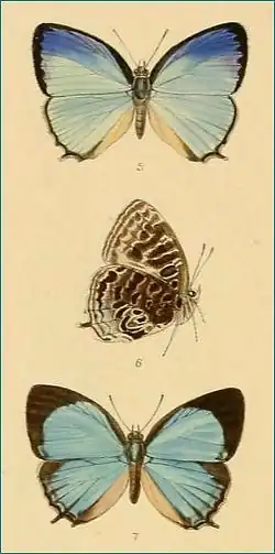 | Arhopala helianthes, male, female, New Guinea, from original description. | |