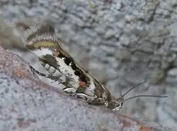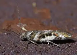 The wingspan is about 13 mm.[3] The base of the forewings is white, iridescent, narrow, but wider on the dorsal than on the costal margin. This is followed by an oblique, ochreous or yellowish-orange band, which crosses the wing and is margined with brown before and behind, and followed by an oblique white band, which also crosses the wing, and is rather widely margined behind by an iridescent, brown line, terminating at a smooth tuft of raised scales on the dorsal margin, the tuft or rather smooth elevation being metallic and highly iridescent, as also are the brown margins of the ochreous bands. The dark brown, posterior margin of the second brown fascia is produced backwards along the disc and passes backwards along the disc, inclining towards, but not reaching the base of the dorsal cilia, and containing three smooth, metallic elevations, like the one on the dorsal margin, the wing between it and the costa being white, and between it and the dorsal margin the wing is white and pale ochreous. The oblique streak terminates just before the dorsal cilia at a curved fascia, which is very convex towards the base, is reddish ochreous on the dorsal margin, and brown on the costal margin. This curved fascia is followed by an oblique one, which is nearest to the tip on the costal margin, and the costal portion of it is wide and white, and the dorsal portion brown, and in some lights is brilliant metallic. The brown portion is narrow where it meets the white costal portion, and passes around behind it to the costal margin, and thence curves as a narrow line backwards around the apex at the base of the cilia, returning to its origin on the dorsal margin, thus enclosing an oblong, egg-yellow or golden patch, parallel with the base of the dorsal cilia. In some lights this fascia is dull brown, not at all metallic, and the yellowish ochreous parts of the wing become almost brick red.[4]