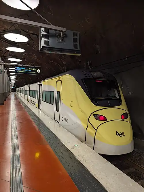 Arlanda North Station (Swedish: Arlanda norra station) is a railway station on the Arlanda Line serving Stockholm-Arlanda Airport in Sweden. The station is one of two stations at the airport to be served by the Arlanda Express, the other being Arlanda South Station. The station is located at the northern end of a dedicated tunnel below the airport and is served by four or five trains per hour. The station serves Terminal 5 of the airport. The station is 39 kilometres (24 mi) from Stockholm Central Station.[1]