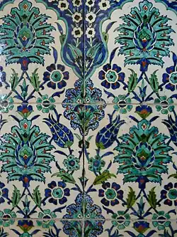 David Ohannessian (1884–1953), who had established a pottery in Kütahya in 1907, is credited with establishing the Armenian ceramic craft industry in Jerusalem.[2] After the Young Turk Revolution in 1908, Ohannessian gained renown for his tile renovations of historic monuments. He worked in cooperation with Kütahya's two other worksops of that era, those owned by Mehmet Emin and by the Minassian brothers--Garabed and Harutyun. In 1911 Ohannessian was commissioned with designing and executing Kütahya tile revetments for the Yorkshire home of Mark Sykes.[2] In late 1915, during the Armenian genocide, Ohannessian was arrested and imprisoned in Kütahya; like many other Armenian notables, he was falsely accused of engaging in revolutionary activities. In early 1916, he and his family were deported from Kütahya by rail and forced march. The family found refuge in Aleppo for nearly two years; they moved to Jerusalem when Sykes suggested that Ohannessian might be able to replicate the broken and missing tiles on the Dome of the Rock, a building then in a decayed and neglected condition.[1][2] Although the commission for repair tiles for the Dome of the Rock was cut short in 1922, the Ohannession pottery in Jerusalem succeeded, as did the Karakashian painters and Balian potters that Ohannessian brought back with him when he briefly returned to Kütahya in the autumn of 1919 to obtain kaolin clays and other needed minerals from Kutahya.[1][2] After about 60 years new Armenian artists started to have their own studios.