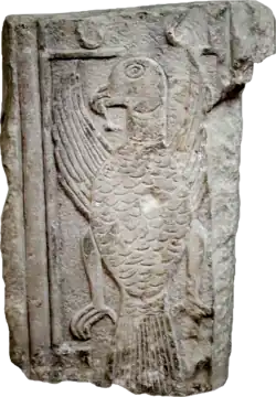 Coat of arms at the Abbey of Ndërfandina (????) Within the marble beam that held the gate of the monastic cell, at the old abbey of Ndërfandina in Gëziq, the Austrian consul in Shkodër, Theodor Ippen, unearthed an epigraphic inscription from the architrave of the Basilica along with a heraldic coat of arms which featured a stone-carved hawk, with one head and two wings outstretched in flight, clutching a ring on its beak.[2] In 1967, digging through the broken fragments which had been stored at the local museum of Rrëshen, researcher Dhimitër Shuteriqi became convinced that the pieces on the inscription formed the words DIMITRI and PROGON, in reference to the princes of the Progonate family of lords that ruled over the territory now known as the Principality of Arbanon.[3]