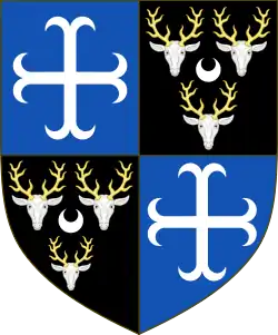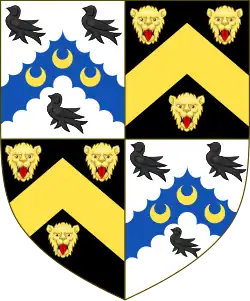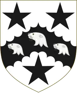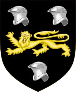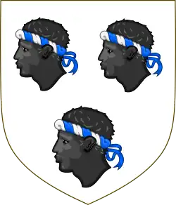 Escutcheon: Argent three Moors' Heads in profile two and one couped Proper wreathed about the temples of the First and Azure Crest: A Demi-lion rampant Argent charged with three Trefoils Vert holding in its dexter paw an Arrow pointing downwards pheoned and flighted Proper shaft Or[13] Motto: Ne cede malis ced contra ("Yield not to misfortunes, but counter them") |