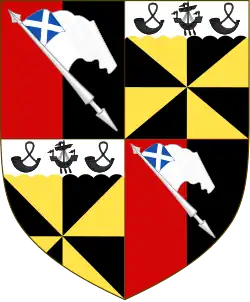 Escutcheon: Quarterly, 1st and 4th, per pale Gules and Sable a Banner displayed bendways Argent thereon a Canton Azure charged with a Saltire of the Third (Bannerman); 2nd and 3rd, Gyronny of eight Or and Sable on a Chief engrailed Argent a Galley her oars in action between two Hunting Horns stringed all of the Second (Campbell of Belmont)[32] Crests: 1st, A Demi-man in armour Proper (Bannerman); 2nd, a Boar's Head erased Proper (Campbell) Mottos: (Above the first crest) Patriæ fidelis; (Above the second crest) Ne obliviscaris[33] Honours: Knight Grand Cross of the Order of the Bath (represented by the Bath circlet in Campbell-Bannerman's full armorial achievement) Kinsmen: Duke of Argyll, Campbell baronets[34] and David Campbell-Bannerman MEP |