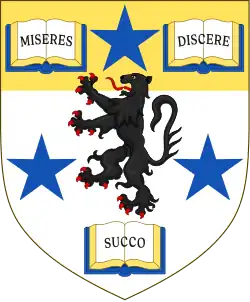 Escutcheon: Argent a Chief Or overall between three Open Books Proper edged Or and bound Azure those in chief inscribed respectively in Letters Sable "Miseres" and "Discere" and that in base also in Letters Sable inscribed "Succo" and as many Mullets Azure a Lion rampant Sable Coronet: that of an Earl Crest: Within Sprigs of Oak fructed Or a dexter Cubit Arm and a sinister Arm embowed both Proper the dexter hand gauntleted Or and with the other brandishing a Two-handed Sword Proper Hilt Pommel and Quillons Sable Supporters: On the dexter side a Lion rampant Gules and on the sinister side an American Bald-headed Eagle Proper both standing upon a Compartment comprising a crenelated Wall Proper in the portal thereof an Anchor Azure and jointed on either side by two Bars wavy Azure to a Grassy Mount growing from that on the dexter a Long Branch and from that on the sinister a Thistle both Proper[42] |