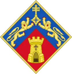 Escutcheon: Per saltire Gules and Argent a castle triple-towered in chief Argent two lions rampant in fess Sable and an eagle displayed in base Or. Coronet: that of an Earl Crest: Issuant from a wreath of oak Proper a castle triple-towered Argent. Supporters: Dexter an eagle Or sinister a lion Or each gorged with a collar Gules and pendent therefrom an escutcheon of the last charged with a tower Argent. Motto: Forti Nihil Fifficile (Power Overcomes Difficulty)[26] | |