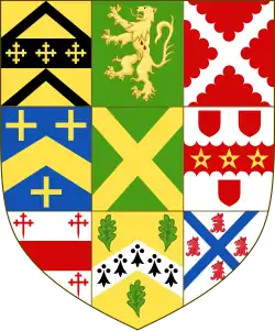 Escutcheon: Quarterly of nine, 1st Or on a Fess between two Chevrons Sable three Cross-crosslets of the Field; 2nd Vert a Lion rampant Or two Goutte d'sang; 3rd Gules a saltire engrailed Argent; 4th Azure a Chevron between three crosses Or; 5th Vert a saltire Or; 6th Argent on a fess engrailed between three Escutcheons Gules three mullets pierced Or; 7th Argent between three Cross-crosslets fitchée a fess Gules; 8th Or between three Oak leaves proper a chevron Ermine; 9th Argent between a saltire Azure four gryphon heads Gules. Crest: A Saracen's Head in profile couped at the shoulders Proper, ducally-crowned Or and from the Coronet flowing a Chapeau Rouge turned down in front tasselled and charged with a Catherine Wheel Or Motto: Sibi constant (Be true unto oneself) |