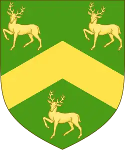 Escutcheon: Vert a Chevron between three Stags at gaze Or Coronet: that of a Viscount Crest: Out of a Coronet composed of Fleurs-de-lis a Mount Vert thereon a Stag at gaze Or Supporters: On either side a Greyhound reguardant Sable Motto: Qualis ab incepto (As it was in the beginning)[14] |