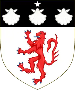 Escutcheon: Gules a Lion rampant within a Bordure engrailed Argent in dexter chief point a Mullet Or[16] Coronet: that of an Earl Crest: A Scaling Ladder Or hooked and pointed Sable Supporters: On the dexter side a Lion guardant Purpure ducally-crowned Or and on the sinister side a Tiger guardant Proper Motto: De bon vouloir servir le Roy (To serve the King with good will)[17] |