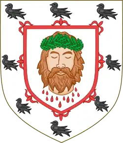 Escutcheon: Argent a savage's head affronté gutté de sang wreathed about the temples with holly proper within an orle flory gules all within an orle of martlets sable Crest: issuant from a wreath of holly vert, a demi-griffin sable, supporting between the claws a sword, the blade enfiled by a bonnet of holly and bay also vert[27] Motto: Fide et virtute (By Faith and valour)[28] |