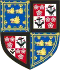 Crest: A lion's jamb erased, sable, holding a trefoil slipped, argent. Supporters: Dexter, a unicorn, ermine, armed, unguled, crined, and tufted, or, and gorged with a chaplet of roses; sinister, a goat, ermine, armed and unguled, azure, gorged as the dexter. Motto: Virtute quies (Rest in virtue)[34] |