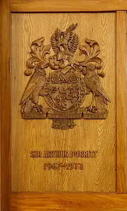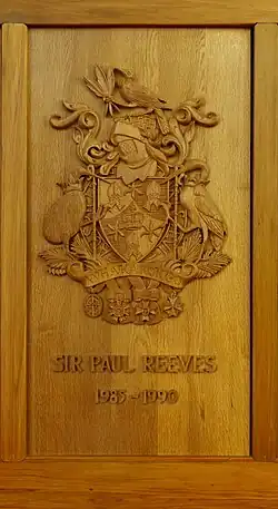 Almost all governors-general have been granted armorial achievements, sometimes known as coats of arms. Carved panels depicting the full achievements of former governors-general is displayed in the Tupaepae (main entrance hall) of Government House in Wellington,[1] with the most recent addition being that of Dame Pasty Reddy.[2]