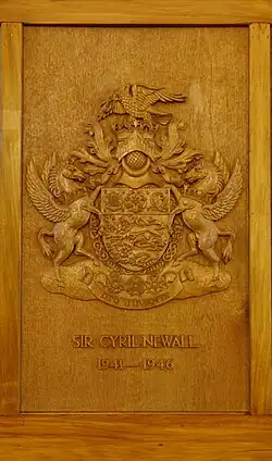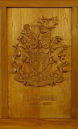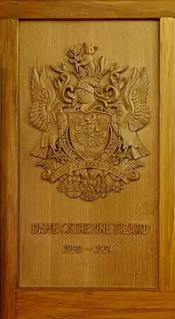 - ^ Dame Silvia Cartwright declined to seek armorial bearings. Her carved panel instead depicts her honours: the collar of the New Zealand Order of Merit, insignia of the Principal Companion of the Queen's Service Order and insignia of a Dame Commander of the Order of the British Empire.[4]