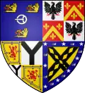 Escutcheon: Quarterly: 1st and 4th azure, three boars' heads couped within a double tressure flory counter-flory, adorned alternately with thistles and fleurs-de-lis, or Gordon; 2nd and 3rd quarterly, within a bordure sable, 1st and 4th gules, three cinquefoils pierced ermine, Hamilton; 2nd and 3rd argent, a lymphad sable, Arran.
