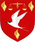 Escutcheon: Gules a White Fronted Tern or Tara (Sterna striata) volant proper between three Trumpet Shells (Charonia tritonis) palewise and in centre chief a Pair of Scales Or.