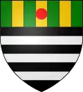 Escutcheon: Barruly Argent and Sable on a Chief Vert three Pallets Or in front of the centre Pallet a Torteau Gules.