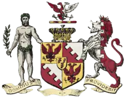 Crest: An eagle with two heads displayed per pale embattled gules and argent. Supporters: Dexter, a savage, wreathed round the temples and loins, and holding in the dexter hand a branch of laurel all proper; sinister, a lion per pale embattled argent and gules. Motto: Dominus providebit (The Lord will provide)[38][39][40] |
