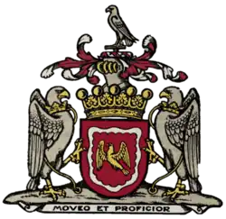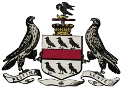 Crest: An eagle sable, preying on a partridge or. Supporters: Two falcons close proper, belled or. Motto: Festina lente (Quick, without impetuosity)[37] |