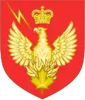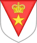 Escutcheon: Per pale Or and Vert a pale wavy of four Azure and Argent in chief a plate displaying a cross Gules charged with the Royal Crown proper; in dexter base a pomeis charged with a garb Or and in sinister base a bezant charged with a fir tree Vert.