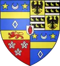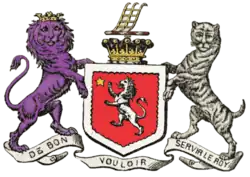 Escutcheon: Gules, a lion rampant, within a bordure, engrailed, argent, in dexter chief point a mullet or. Crest: A scaling ladder, or, hooked and pointed sable. Coronet: That of an Earl Supporters: Dexter, a lion guardant, purpure, ducally crowned, or; sinister, a tiger, guardant, proper. Motto: De bon vouloir servir le roy (To serve the king with good will)[14] |