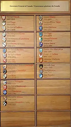 Prior to 1952, the majority of governors general inherited their arms and as such the designs of those arms usually do not reflect them personally. Plaster carvings of the coats of arms of the first twelve governors general after confederation, from Lord Monck to Lord Byng, are displayed in the chambers of the Speaker of the Senate of Canada.[1][2]