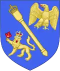 Escutcheon: Azure the Mace of the House of Commons of Canada Or in bend between in chief an eagle displayed Or bearing in its beak a bolt of lightning Gules and in base a lion passant guardant Or imperially crowned proper holding in the dexter paw a maple leaf Gules fimbriated Or.