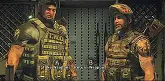 An example of how a Morality cutscene is in play. Here, Rios and Salem are confronted by a security guard (unseen) before they take out assault rifles from a rifle rack. You can see the buttons on the screen which will denote the fate of the scene and the decision players make.