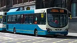 As of April 2022, vehicles in the fleet are in the process of being rebranded into the new fleet livery, which was introduced to the region in January 2018. It consists of an all-round aquamarine base with white diagonal stripe, featuring the company's updated logo.[27] The former livery was introduced over twenty years prior, and consisted of vehicles painted in an aquamarine base, with a cream semi-circle at the front, and yellow stripe along the side of the vehicle. It was later revised, with a dark blue skirt incorporated into the livery.[9][10][11]