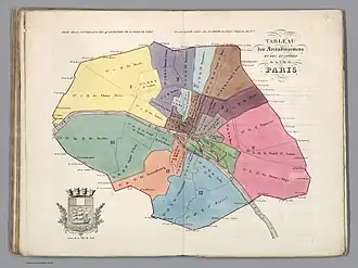 In policing terms, before 1850 the city was divided into quarters, each with a police commissariat, but given the unequal sizes of the quarters and their populations some commissariats were more overstretched than others. This critical situation made the administration decided to redivide the quarters to make them a little more equally sized.[2] · [3] By a decision of 27 December 1849 (coming into force on 1 April 1850) the prefect of police divided Paris into 48 sections corresponding to the 48 police commissariats. After that the 3rd, 4th, 7th and 9th arrondissements had only three sections each, the 6th, 10th, 11th and 12th arrondissements each had four, and the 1st, 2nd, 5th and 8th arrondissements had five each.[3]