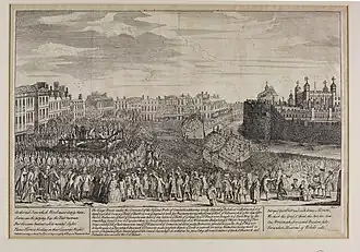 Balmerino went to his execution unrepentant, stating "If I had a thousand lives, I would lay them all down in the same cause".[8] His insouciant attitude at the time of his trial and execution – joking with bystanders and insisting on taking the axe in his carriage so that Kilmarnock would not be bothered by it – was widely reported in the media of the time.[9] Horace Walpole, in a letter, described him as "the most natural brave old fellow I ever saw [...] at the bar he behaved like a soldier and a man: in the intervals of form, with carelessness and humour".[8] Balmerino's execution is sometimes reported to have taken three blows, though "the first certainly took away all sensation".[10][8] Like Kilmarnock, he was buried in the Church of St Peter ad Vincula in the Tower of London: reportedly, at his request, alongside William Murray, Marquess of Tullibardine.