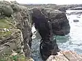 At low tide, there is access to a sand deposit delimited by a rocky wall made from slate and schist forming 30 metre arches resembling cathedral flying buttresses, large caves, sand corridors between rocky blocks, and other geological features. Particularly low tides create access to nearby beaches through the sand extension. As the coast stretch is almost horizontal, the water covers the beach again very quickly.