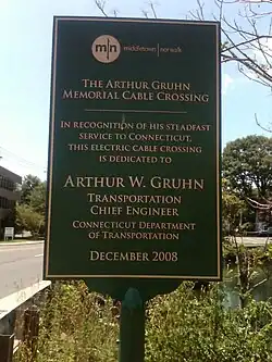 The Arthur Gruhn Memorial Cable Crossing plaque was erected on Connecticut Route 130 at the Bridgeport-Fairfield town line on March 24, 2009. It is in recognition of ConnDOT Chief Engineer Gruhn's work by Connecticut Light & Power and the United Illuminating Company for his work allowing for the Middletown-Norwalk transmission line upgrade.[3] Engineer Gruhn's work provided for a practical electric system upgrade while environmentally preserving Ash Creek.[4]