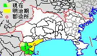 Map of Ashigarashimo District with Meiji period area in yellow, modern area in green
