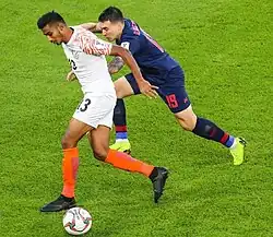 Kuruniyan in action against Thailand national football team in the 2019 AFC Asian Cup.