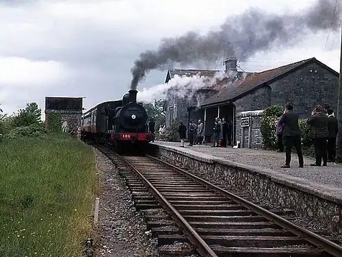 The station building and platform still stand next to the mothballed railway, with some of the station structures in use as a private house since the line was closed in 2003.[4] The station house is a protected structure.[1][5]