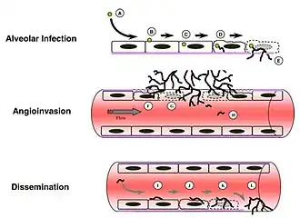 - ^ a b c d e f g h i j k l m Ben-Ami R, Lewis RE, Kontoyiannis DP (August 2010). "Enemy of the (immunosuppressed) state: an update on the pathogenesis of Aspergillus fumigatus infection". British Journal of Haematology. 150 (4): 406–17. doi:10.1111/j.1365-2141.2010.08283.x. PMID 20618330. S2CID 28216163.