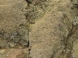 Aspicilia pacifica (pacific sunken disk lichen) is a white to grayish, brownish, or ocher crustose areolate lichen that commonly grows on siliceous rock or basalt along the seashore and in higher coastal mountains of California and Baja California.[1]: 2** [2] It has numerous small (0.1–.8 mm), round to angular apothecia toward the middle of the thallus, with concave to flat black discs that are sometimes lightened with white pruina.[2] Lichen spot test on the cortex and medulla are I−, K+ yellow to red, P+ orange, and C−.[2] Secondary metabolites include much stictic acid, and some norstictic acid.[2]