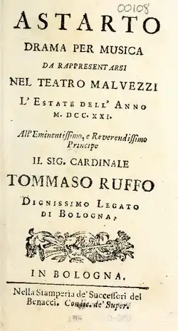 Astarto is an opera in three acts by Giovanni Bononcini to a libretto by Paolo Rolli, after Apostolo Zeno and Pietro Pariati. It was premiered in January 1715 in Rome at the Teatro Capranica, then revised for the King's Theatre, Haymarket, in London on 19 November 1720 with contralto castrato Senesino.[1][2]