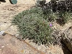 This is a small perennial herb forming low tufts up to 30 centimeters wide in cracks and sandy depressions in sandstone cliffs and pavement. The sandstone is of Cretaceous origin, and local formations include the Point Lookout Sandstone.[4] The matted leaves are each up to 4 centimeters long and are made up of several oval or nearly rounded leaflets no more than 2 millimeters long. As the plant withers and prepares to go dormant, the leaves lose all the leaflets and persist as naked sharp spines. Blooming occurs for a short period in the spring. The plentiful tiny flowers are bright pink-purple with a spot of white streaking at the middle. The flowers are fragrant with a sweet smell and are very attractive to butterflies. Multitudes of butterflies rest on the plant when it is in bloom.[3][4] The painted lady (Vanessa cardui) is a common visitor.[3][4][5]