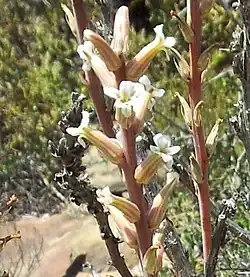 Its stems are described as densely covered in sharp, triangular succulent leaves, with a glossy leaf-surface, a grey-brown colour, and with white margins and keels. This species produces small, robust, cream-white flowers in May to October (southern hemisphere), on an unbranched inflorescence. The flowers typically do not have pedicels (sessile), and their lobes curve outwards. The peduncle is robust and relatively short. Several large, elongated, veined, sterile bracts appear along the peduncle.[3]